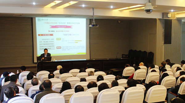 11月27日,由校离退休处主办的“十八届五中全会精神解读”专题讲座在图书馆报告厅举行。校党委副书记、校关工委主任、博士生导师唐亚阳教授担任主讲。